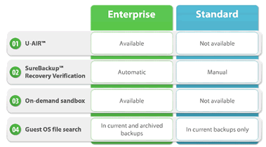 - U-AIR™(Universal Application-Item Recovery) - restaurati obiecte individuale din orice aplicatie virtualizata, din orice sistem de operare, ruland aplicatia din backup intr-un mediu izolat - disponibil doar in varianta Enterprise